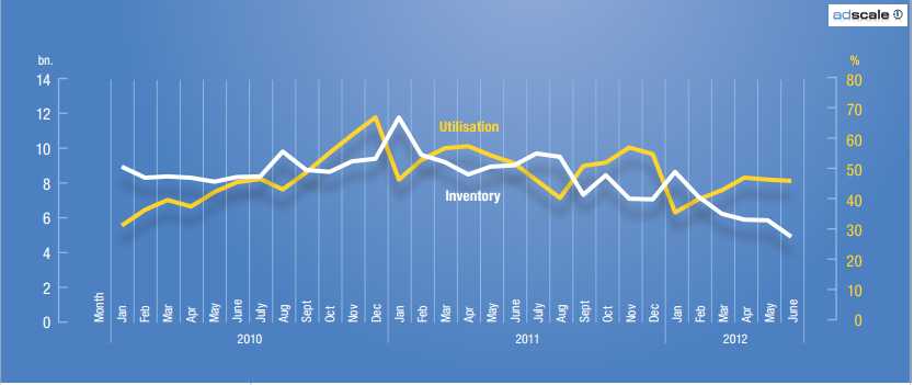 Average monthly figures are presented in every case. Example: 4.9 billion ad impressions were offered on adscale in June 2012. In the same month, 2.5 billion ad impressions or 46% were actually sold (utilisation = percentage of total available inventory that was sold). Utilisation on adscale is not equivalent to the total utilisation of publishers and marketers.