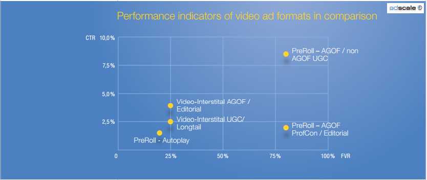The demand for video advertising remains high. In the first half of 2012, adscale made 16% of its revenues through video formats (compared to 10% in 2011). Contrary to common prejudice, most users watch pre-roll ads in their entirety from start to finish. The full view rate (FVR) of pre-rolls that play immediately before video content, and hence are actively accessed by users, averages around 80%. That means that four out of five users see the entire video ad, and it makes no difference whether the pre-roll comes before professionally produced content or user-generated clips. Autoplay video ads, which start automatically when a user accesses a website, do not have these high view rates. Since users do not actively decide to consume the video content, only one in five (20%) watch the ad to the end. Interstitials, which also start automatically, likewise have a low full-view rate of 25%.