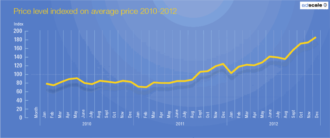 The German market for digital advertising is currently being shaped by two main developments: the demand for automated media purchasing, as well as efficient campaign control via real-time bidding and targeting. Both are clearly impacting the price level. The prices in 2012 were on average 42% higher than the average price over the past three years. In addition to RTB and targeting, the persistent high demand for large-area special ad formats and video advertising influence this development. This is confirmed by the results in the current adscale Analyzer 1/2013, a study focused on price development in the German online advertising market.