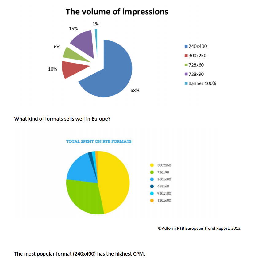 The most popular format in Russia is 240x400, and as expected it is also the most popular format in RTB auctions. Almost 70% of impressions won through auctions were sold in this format. The next most popular formats are 728x90 and 300x250, which are the leaders in the European RTB market.