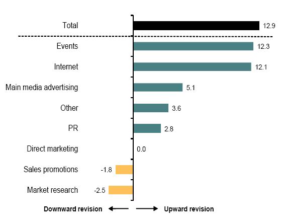 Online marketing continued to gain an increasing share in the marketing mix of companies, recording a net balance of +12.1% for Q4 2016. That compared to Q3’s +9.5% and was the best reading for two years. Within internet, mobile advertising increased, recording a net balance of +3.9%, compared to -2.6% in the preceding quarter; while internet search/SEO recorded a net balance of +7.1%, down slightly on Q3’s 7.3%. Panelists widely reported that digital marketing tools continued to offer positive investment returns by providing good opportunities to attract new customers within a manageable cost framework.